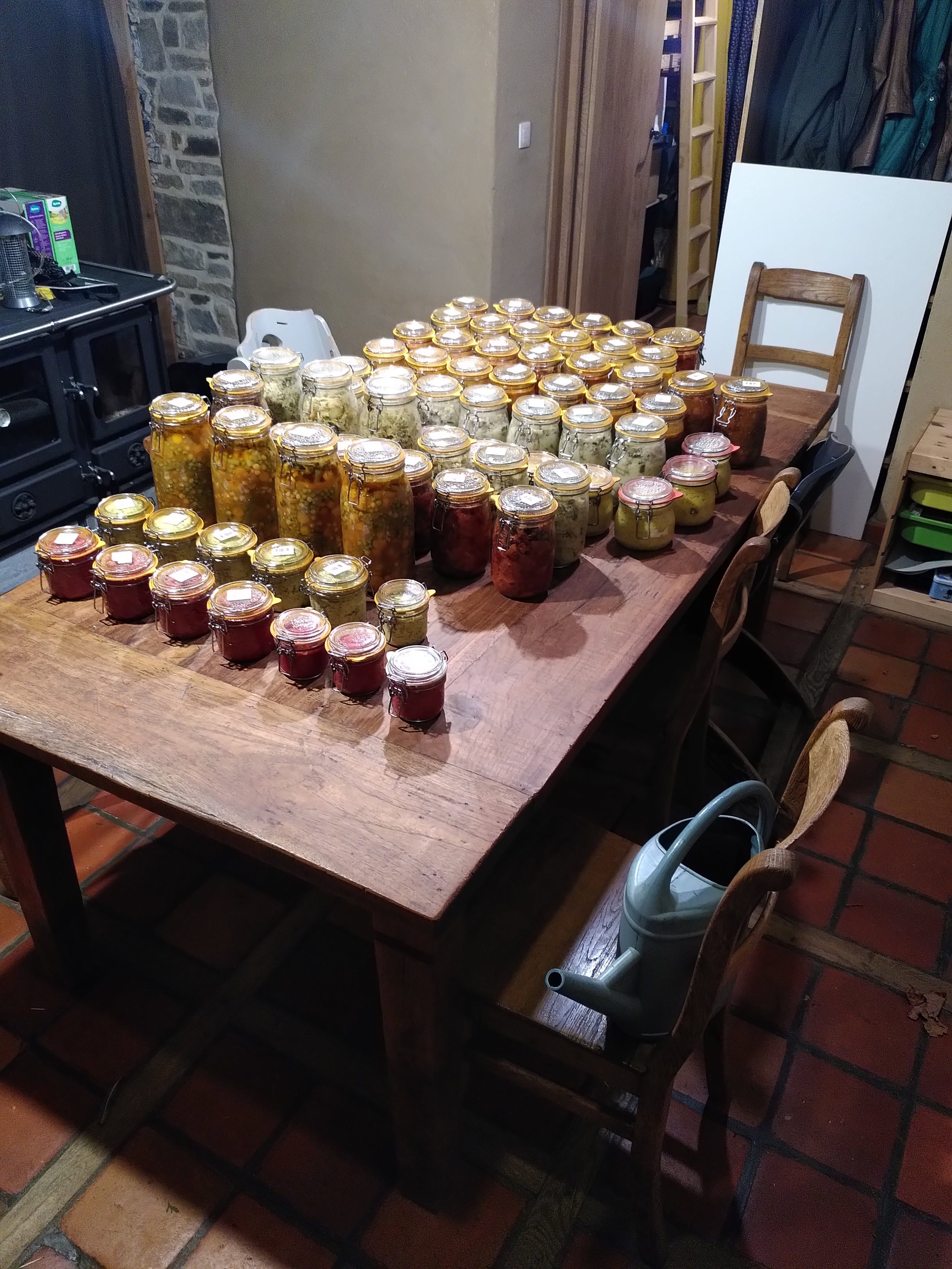 Réaliser ses conserves pour l’hiver présente plusieurs avantages : gérer les afflux de récoltes du potager pour pouvoir les consommer au besoin plus tard, gain de temps pour la préparation de recettes, gain économique grâce à l’achat de légumes en circuit-court, nourriture de qualité, moment de cuisine collective pour la préparation des conserves avec la possibilité de se regrouper à plusieurs familles. Lors de la dernière édition, nous étions 3 familles et avons produit 240 pots de 1 litre pour 15 recettes différentes et une cinquantaine de pots de houmous, tout ça en 2 jours. Cela nous a coûté environ 500 €/famille soit moins de 5 € par repas de 4-5 personnes (1 pot de 1 litre permet en moyenne de faire un repas à 5).
