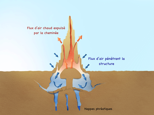 Un principe de régulation thermique de certaines termitières est d’assurer une ventilation par convection naturelle. L’air chauffé en journée par les apports solaires va se dilater et voir sa densité baisser ce qui aura pour effet de le faire monter dans une cheminée centrale. De l’air extérieur est alors aspiré via des ouvertures située dans le bas de la termitière et rafraîchi par le passage à proximité de la nappe phréatique. Transposé au bâtiment, deux solutions ont été mise en oeuvre. Pour chacune, une ouverture dans le haut de chacun des bâtiments a été prévue pour laisser l’air chaud s’échapper ainsi qu’une entrée d’air frais dans le bas : l’une simplement par l’ouverture d’une fenêtre au Nord à l’ombre des arbres, ces derniers rafraîchissant l’air extérieur par évapotranspiration, et l’autre au moyen d’un puits canadien (voir réalisation sur le sujet). On profite également d’un free-cooling la nuit en laissant toutes ces ouvertures ouvertes. Le résultat est une climatisation de l’ambiance autour de 25°C en période caniculaire (jusque 40°C extérieur), et ça sans consommation énergétique, c’est un système passif à 100% comme chez les termites.